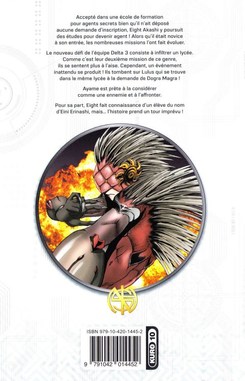 L'auteur de K en-Ichi, le disciple ulti me nous régale avec une comédie scolaire dynamique et renversante dans un lycée pour agents secrets. Accepté dans une école de formation pour agents secrets bien qu'il n'ait déposé aucune demande d'inscription, Eight Akashi y poursuit des études pour devenir agent !Alors qu'il était novice à son entrée, les nombreuses missions l'ont fait évoluer. Le nouveau défi de l'équipe Delta 3 consiste à infiltrer un lycée. Comme c'est leur deuxième mission de ce genre, ils se sentent plus à l'aise et moins nerveux. Cependant, un événement inattendu se produit ! Ils tombent sur Lulus qui est dans le même lycée à la demande de Dogra Magra !Ayame est prête à la considérer comme une ennemie et à l'affronter, mais la réaction de Lulus est...Pour sa part, Eight fait connaissance d'un élève du nom d'Eini Erinashi, mais...l'histoire prend un tour imprévu ?!!