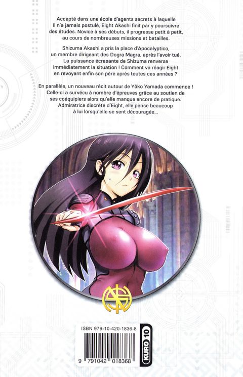 L'auteur de Ken-Ichi, le disciple ultime nous régale avec une comédie scolaire dynamique et renversante dans un lycée pour agents secrets. Accepté dans une école d'agents secrets à laquelle il n'a jamais postulé, Eight Akashi fifinit par y poursuivre des études. Novice à ses débuts, il progresse petit à petit, au cours de nombreuses missions et batailles. Shizuma Akashi a pris la place d'Apocalyptico, un membre dirigeant des Dogra Magra, après l'avoir tué. La puissance écrasante de Shizuma renverse immédiatement la situation ! Comment va réagir Eight en revoyant enfifin son père après toutes ces années ? En parallèle, un nouveau récit autour de Yôko Yamada commence ! Celle-ci a survécu à nombre d'épreuves grâce au soutien de ses coéquipiers alors qu'elle manque encore de pratique. Admiratrice discrète d'Eight, elle pense beaucoup à lui lorsqu'elle se sent découragée...