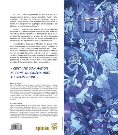 2017 marque la date anniversaire choisie pour célébrer les 100 ans de l'animation japonaise. Le projet de livre Un siècle d'animation japonaise arrivait donc à point nommé cette année : édité par Ynnis Éditions (éditeur des cultures de l'imaginaire, après Une année japonaise et Ghibli, les artisans du rêve) et écrit par Philippe Bunel et Matthieu Pinon (deux journalistes spécialistes de la pop culture japonaise), le titre rend hommage à cet art dans sa dimension nippone. L'histoire de l'animation japonaise détaillée par les auteurs se veut intergénérationnelle. Véritable rétrospective des oeuvres, des studios et des technologies qui ont marqué le 20e siècle, le livre aborde l'animation à travers les prismes de l'histoire du Japon, des évolutions sociétales et techniques. De par la qualité de son contenu et de sa maquette, Un siècle d'animation japonaise séduira les passionnés d'animation, les amateurs de culture japonaise, les curieux qui souhaitent étendre leurs connaissances sur le sujet, mais aussi les parents qui voudraient offrir à leurs enfants un ouvrage éducationnel. Concernant la fabrication du livre, la couverture ci-jointe n'est que provisoire vu qu'elle représentera une illustration très graphique réalisée par Thomas Romain, artiste décors français au Japon reconnu dans le milieu. Elle mettra en scène des personnages culte de l'animation japonaise. La maquette du livre sera moderne, épurée et colorée pour mettre en valeur les visuels autant que le texte. Elle reprendra le format et des codes graphiques d'Histoire(s) du manga moderne car le livre fera partie de la même collection chez Ynnis Editions.
