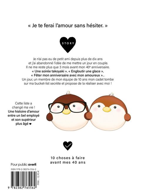 Je n'ai pas eu de petit ami depuis plus de dix ans et j'ai abandonné l'idée de me mettre un jour en couple. Il ne me reste plus que 3 mois avant mon 40e anniversaire. " Une soirée takoyaki ", " Engloutir une glace ", " Fêter mon anniversaire avec mon amoureux "... Un jour, un membre de mon équipe de 10 ans mon cadet tombe sur ma bucket-list secrète et propose de la réaliser avec moi !