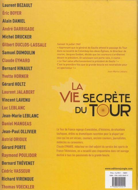 2013 est l'année du centième tour de France, un événement à ne pas manquer ! Jungle célèbre ainsi l'événement avec un beau livre regroupant un collectif de dessinateurs illustrant des témoignages amusants de personnalités connaissant bien ce sport tel Michel Drücker, Bernard Thevenet, Gérard Holtz... Ils racontent des anecdotes amusantes et émouvantes sur les tours passés, ses coulisses et ses sportifs les plus célèbres.
