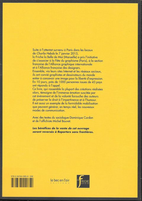 Suite à l'attentat survenu à Paris dans les locaux de Charlie Hebdo le 7 janvier 2015, la Friche la Belle de Mai (Marseille) a pris l'initiative de s'associer à la Fête du graphisme (Paris), à la section française de l'Alliance graphique internationale et à l'Alliance française des designers. Ensemble, via leurs sites internet et les réseaux sociaux, ils ont convié graphistes et dessinateurs du monde entier à concevoir une image pour la liberté d'expression. En 10 jours, près de 1000 personnes issues de 43 pays ont répondu à l'appel. Ce livre, mis en page par l'affichiste Michel Bouvet, qui rassemble la plupart des créations réalisées alors, témoigne de l'immense émotion suscitée par cet événement et de la volonté farouche des auteurs de préserver le droit à l'impertinence et à l'humour. Il est aussi un exemple de la formidable mobilisation que peuvent générer, en temps réel, les nouveaux modes de communication. Le sociologue Dominique Cardon accompagne cette somme d'images d'un texte qui analyse la diffusion du hashtag #JesuisCharlie et le phénomène récent de déplacement de l'acte militant de terrain vers un activisme numérique, renouvelant les modalités de l'engagement citoyen.