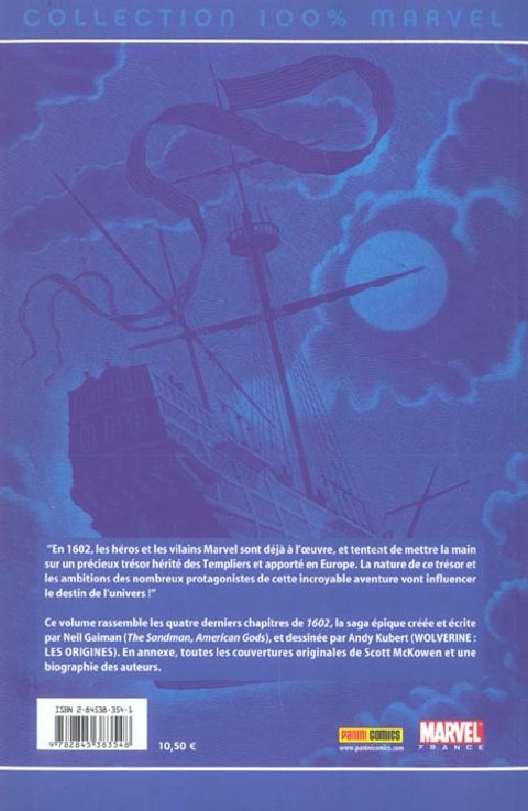 Second et dernier numéro consacré à la maxi-série de Neil Gaiman (Sandman), superbement illustrée par Andy Kubert. La chasse au trésor des Templiers est ouverte et nombreux sont ceux qui rêvent de s'emparer de ce qui pourrait être une arme de destruction invincible. Tous les secrets de l'univers Marvel en l'an 1602 vous sont révélés dans ce nouvel album qui accueille les plus fameux héros et criminels