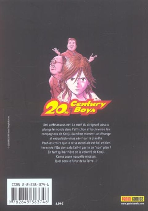 Dans ce nouveau volume de *20th Century Boys*, les dessins brillants d'Urasawa Naoki enrichissent une intrigue pleine de rebondissements. L'annonce de la mort d'Ami suscite des réactions diverses dans le monde entier. Tandis que la résistance dirigée par Yoshitsune et les anciens compagnons de Kenji voient la fin de leur (...) Voir le commentaire