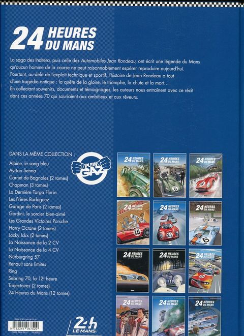 Jean Rondeau : David contre GoliathDans la mémoire de tous les aficionados du Mans, Jean Rondeau demeure « l’enfant du pays ». Le seul à avoir remporté les « 24 Heures » au volant d’une auto portant son nom, construite au Mans, par sa propre équipe ; face à une armada de grands constructeurs. À la manière de David contre Goliath. La saga des Inaltera, puis des Automobiles Jean Rondeau fait aujourd’hui figure d'épopée antique et mythique, qu’aucun homme de la course ne peut raisonnablement espérer reproduire. Pourtant, au-delà du mythe de l’exploit technique et sportif, cette histoire respire le romantisme, l’ambition, la détermination, la trahison, l’amour et la mort. Tous les ingrédients de la tragédie antique sont là : la quête de la gloire, le triomphe, la chute et la mort. Sauf qu’ici, c’est dans « la vraie vie » ; ce qui fait que ce récit est bien davantage qu’une simple histoire de course automobile ! En collectant souvenirs, documents et témoignages les auteurs nous entraînent dans ces années 70 qui souriaient aux ambitieux et aux rêveurs.