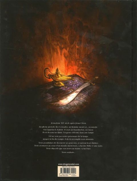 Le Moyen âge, quelque part en Orient... Un jeune homme meurt... et ressuscite. Il était un haschischin, un tueur surentraîné. Il est devenu un djinn. Un génie, enfermé dans une lampe... Pour l'éternité ? Pas si sûr. Car il peut peut-être se libérer. S'il ne veut pas rester prisonnier de la lampe jusqu'à la fin des temps, il devra accomplir trois missions. Trois possibilités de découvrir ses pouvoirs et leurs limites. Trois aventures pour découvrir un monde nouveau, celui des Mille et une Nuits. Trois occasions d'explorer ses mystères et sa noirceur. Il devra atteindre les trois objectifs que son maître va lui fixer. Ses trois souhaits. Une nouvelle approche de l'univers des Mille et Une Nuits par deux auteurs férus de cinéma d'action et de jeux vidéo.