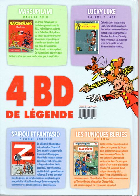Regroupe les albums suivants : - Z comme Zorglub (Spirou et Fantasio) - Mars le noir (Marsupilami) - Blue Retro (Les Tuniques Bleues) - Calamity Jane (Lucky Luke)