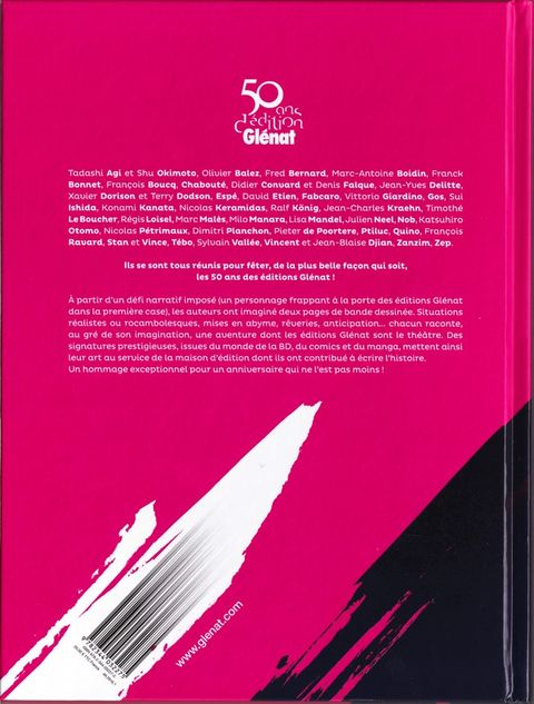Un hommage exceptionnel pour un anniversaire qui ne l'est pas moins. Un auteur frappe à la porte des éditions Glénat... À partir de ce postulat de départ, tout peut arriver ! Ce défi narratif, plusieurs auteurs de la maison Glénat ont décidé de le relever. Situations réalistes, rocambolesques, mises en abyme, rêveries, anticipation... chacun raconte, au gré de son imagination, sur 2 pages, une aventure dont les éditions Glénat sont le théâtre. Des signatures prestigieuses, issues du monde de la BD, du comics et du manga, mettent ainsi leur art au service de la maison d'édition dont ils ont contribué à écrire l'histoire.En 2019, Glénat célèbre ses 50 ans de création. 50 ans d'édition, 50 ans de passion que le présent ouvrage avec une magnifique couverture de Nicolas Pétrimaux vous propose de retracer d'une manière aussi originale qu'audacieuse. Le cadeau exceptionnel pour un anniversaire qui ne l'est pas moins.