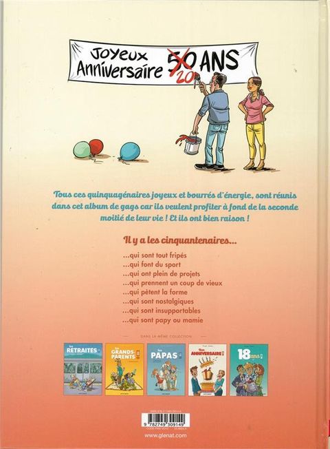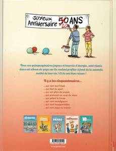 50 ans, ça marque !Le « bel âge », ça vous saute à la figure sans crier gare comme une crème anti-rides inefficace. Votre carrière est déjà derrière vous, votre corps ne récupère plus comme avant, les nouveaux magazines « spécial quinqua » sont sans arrêt là pour vous rappeler votre âge, et que dire de votre mari prêt à vous abandonner pour la première jeunette venue ?Alors que certains sont même déjà grands-parents, Jacky Goupil et Jack Domon vous aident à passer ce cap avec le sourire dans une nouvelle série humour de gags en une planche qui vise toujours juste. 50 ans, après tout, c'est rien de moins qu'un jubilé... Alors, jubilons !