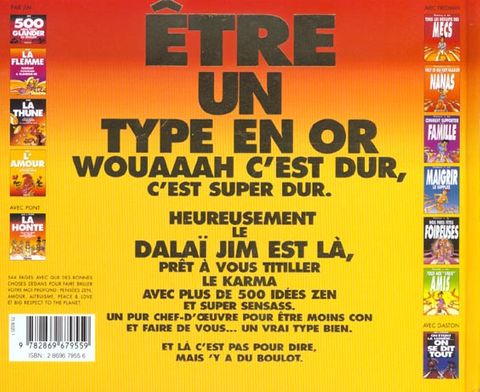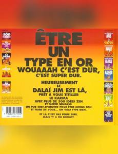 Etre quelqu'un de bien, c'est dur, c'est très très dur. Et c'est carrément pas dans la nature de l'être humain. Alors avant d'être quelqu'un de bien, il va falloir bosser sévère. Heureusement, le Dalaï Jim est là, prêt à vous chatouiller le karma avec plus de 500 idées zen et super sensass. Un feu d'artifice de bonté qui vous illuminera et fera de vous un vrai type bien. Et Dieu sait qu'y'a du boulot ! Les héros de cet album vont tenter d'ouvrir leurs shakras un à un, pour atteindre l'état d'être illuminé. Mais leurs caractères définitivement humains ne les aideront pas vraiment dans cette noble perspective. Derrière la déconne, cet album est profond, car il y a des vrais bouts de vérité à l'intérieur, pour essayer d'être un peu moins neu-neu au jour le jour...Après le mirifique "500 idées pour glander au boulot", un des plus gros succès de "Jim", son album le plus médiatisé (vu et revu sur Canal +, « Nulle Part Ailleurs » midi et soir, plusieurs fois chez Vandel, Drucker, Dechavanne, etc...), voici maintenant "500 idées en or pour être quelqu'un de bien", album à la magnifique couverture Or, qui fera jaillir la « Dalaï Lama attitude » qui sommeille en vous.