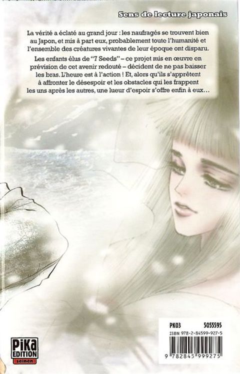 la vérité a éclaté au grand jour : les naufragés se trouvent bien au japon, et mis à part eux, probablement toute l'humanité et l'ensemble des créatures vivantes de leur époque ont disparu. les enfants élus de ""7 seeds"" - ce projet mis en oeuvre en prévision de cet avenir redouté - décident de ne pas baisser les bras. l'heure est à l'action ! et, alors qu'ils s'apprêtent à affronter le désespoir et les obstacles qui les frappent les uns après les autres, une lueur d'espoir s'offre enfin à eux.