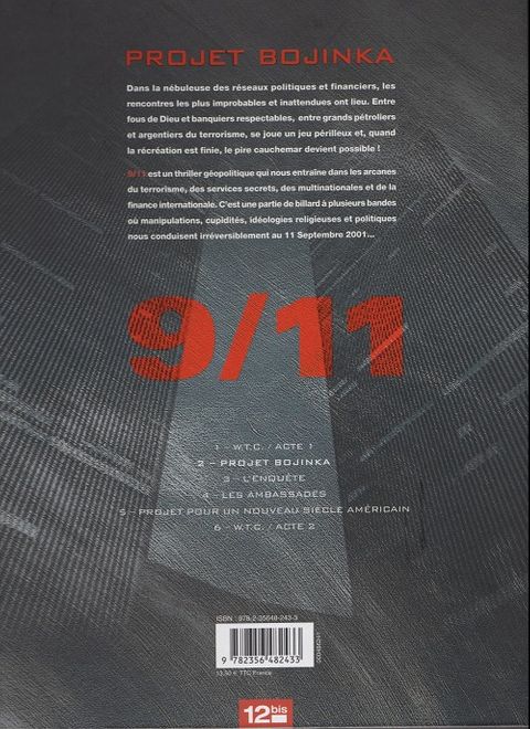 Dans ce second opus il est question de l'opération Bojinka, connue aussi sous le nom de projet Bojinka, action qui visait, en 1995, à réaliser une série d'attentats contre des avions de ligne américains. Cette opération avortée servira malheureusement de référence aux auteurs des attentats du 11 septembre. A mi-chemin de 24 heures chrono ou des univers interlopes de John Le Carré, la série BD 9/11 est conçue pour un large public toujours friand de connaître " le dessous des cartes " des affaires internationales...