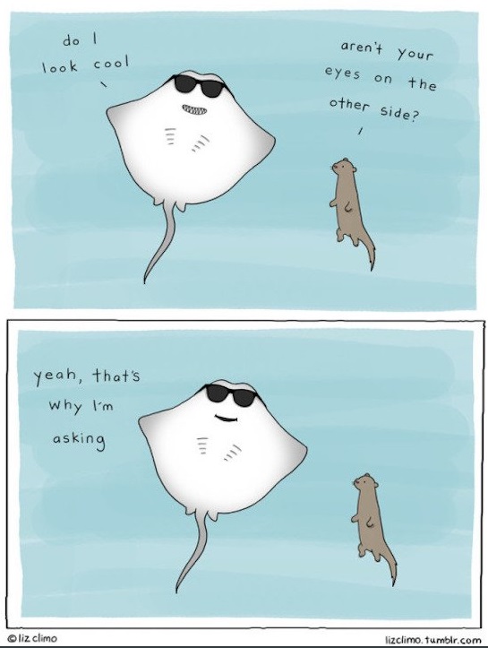 Liz Climo est probablement l'illustratrice que je suis depuis le plus longtemps sur internet. Parce qu'elle est tordante, mais surtout parce que son humour est le plus mignon et le plus bienveillant du monde. Et c'est pas chiant. Je le précise parce que dit comme ça, on dirait. Le truc de Liz Climo, c'est de mettre en scène des animaux dans des BD d'une ou deux cases. Et de mon côté, elle fait mouche à chaque fois ! Un exemple :