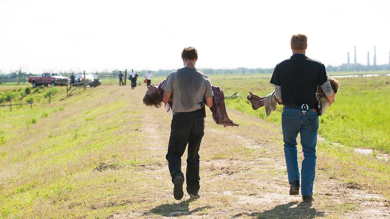 Fin technicien du tapuscrit, Pizzolatto distille finement les informations et démarre sa série avec un premier acte en 3 épisodes plus en retenue que la suite, où les relations tiennent plus de place que l'enquête en elle-même, ce qui va s'inverser au fur et à mesure, pour laisser la place à l'accomplissement des deux héros lors d'un dernier chapitre dantesque. C'est d'ailleurs un reproche que l'on peut faire à l'auteur, qui a sacrifié une partie de sa richesse sur l'autel du montage serré d'HBO. En effet, Maggie est remariée à la fin de la série, comme il l'a avoué en interview, ce qui change drastiquement la façon de voir le futur de Hart à sa sortie du Lafayette Hospital (là où certains imaginent le happy ending vicieux au point de le renvoyer une nouvelle fois aux côtés de sa femme et de ses filles - pour recommencer les mêmes erreurs plus tard?).