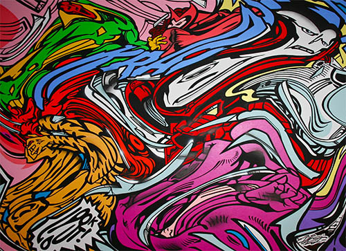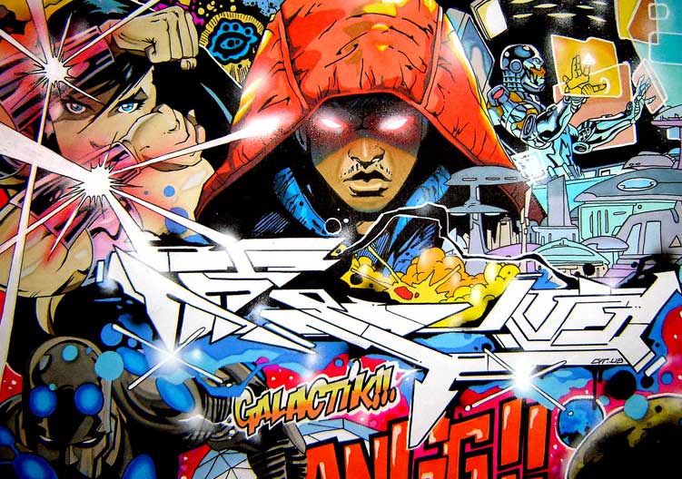 Pour l’historique, sachez que Pro a débuté le dessin à l’âge de 5 ans en autodidacte. Influencé par l’oeuvre de Jack Kirby et l’univers des super héros Marvel allant de Strange à Nova, il se passionne dès 1989 pour le graffiti en découvrant les fresque de deux légendes du graffiti : Mode2 et Colt.