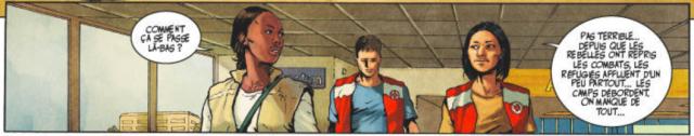 Il devient alors le souffre-douleur de son groupe, le "pisseux" peureux et sans courage. On laisse Samy pour faire la rencontre de Florence, une photo-journaliste belge venue en Afrique pour découvrir un campement du CICR, le Comité International de la Croix-Rouge. C'est finalement deux aspects de la situation que le scénariste Frédéric Richaud nous propose de suivre : d'un côté la pression que subissent les enfants-soldats, d'un autre côté les réfugiés qui pleurent la perte de leurs proches.