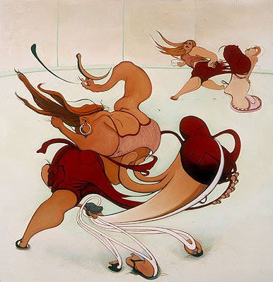 Bien que différents sur certains détails (le travail du trait et de la couleur), les style des deux artistes peuvent être facilement apparentés, notamment si l'on observe la représentation des formes, de l'anatomie, de la mise en page, du mouvement et des compositions. Essenhigh possède un style très particulier où rien de semble solide ni structuré, tout y est rondeur et mollesse, ce que l'on retrouve chez Zep dans sa capacité à arrondir ses formes, à fluidifié son trait, à rendre organique l'anatomie humaine (ce qui pourrait passer pour un pléonasme plastique). Chez les deux artistes, nous observons des formes et des compositions avant d'observer des personnes. Nous sommes fascinés par ces êtres protéiformes qui se mettent en mouvement devant nos yeux, comme une réalité déformée par un miroir ondulé. Ce sont ces formes fluides, rondes et équilibrées qui rendent ces images si fascinantes !