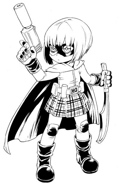 On commence avec un croisement des genres, quand le mangaka Etorouji Shiono, que l'on retrouvera bientôt avec le seizième tome d'Übel Blatt qui sort chez Ki-oon à la fin du mois, qui livre sa version de Hit-Girl, le fameux personnage de Mark Millar et John Romita Jr. que l'on découvrait pour la première fois dans Kick-Ass.