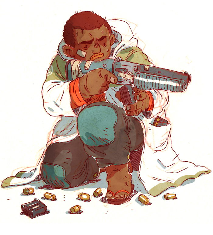 Guillaume Singelin a annoncé que sa prochaine BD, P.T.S.D., sortirait en 2017. Il faudra donc s'armer de patience pour la feuilleter, mais l'artiste français ne nous oublie et nous fait patienter avec cette esquisse d'un personnage que nous retrouverons dans ces pages.