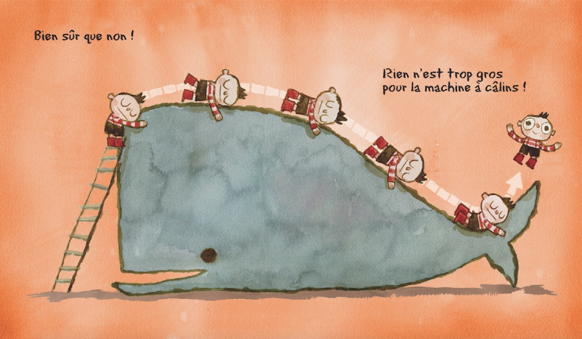 Le texte, d'abord, est court (une phrase par page) mais hilarant (saluons le travail de traduction : même en français c'est vraiment drôle). Ce livre invite vraiment à jouer avec les intonations à la lecture pour appuyer le ton dynamique du héros, et ça fonctionne : les enfants sont captivés, et rient beaucoup. En plus d'être drôle, l'histoire est ultra positive et adorable, remplie d'un message tout simple mais ô combien juste : faire des câlins, c'est au moins aussi cool que d'en recevoir.