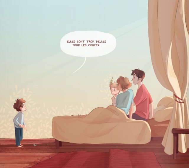 Commence alors la cohabitation compliquée entre le jeune garçon et ses fleurs. Parfois, elles le mettent mal à l'aise tant elles sont voyantes. Parfois au contraire elles le rendent unique, apaisé, et tellement beau. À travers les yeux du petit frère, grand frère va apprendre à s'habituer à cette étonnante couronne qui fait briller sa chevelure.