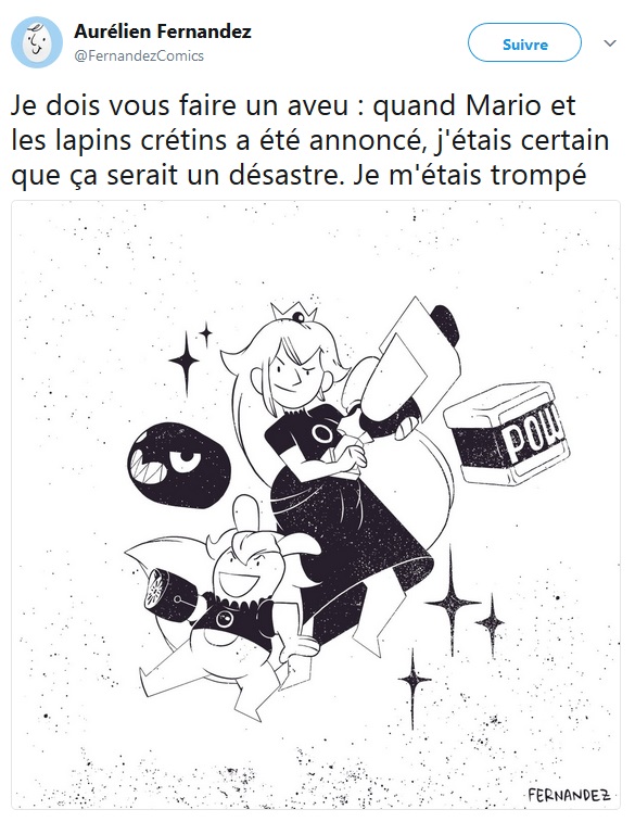 Aurélien Fernandez est une personne pleine de talent : en plus de dessiner, il joue pas mal aux jeux vidéo. Ici, il rend hommage à la Princesse Peach qui tabasse dans Mario et les Lapins Crétins, sorti fin août sur Switch. Et si vous voulez mon avis sur le jeu, sachez que moi aussi je l'ai trouvé top.