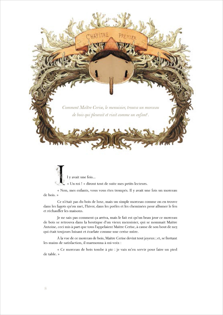 On pouvait s'y attendre avec la collection Métamorphose, ce Pinocchio est un superbe objet. Soigné dans les moindres détails, dessins et mots s'entremêlent avec grâce. En plus des illustrations pleines pages, des dessins, en couleurs ou en noir et blanc, se glissent au milieu du texte. Les entrées de chapitres méritent à elles seules d'être observées un moment. Si l'on devait mettre un minuscule bémol à l'ensemble : quelques chapitres se closent par une page entièrement blanche, qui casse un peu la fluidité de la lecture. Mais ce choix est aussi intéressant, d'abord parce qu'il appuie l'effet 'feuilleton' de la construction, qui respecte vraiment l'oeuvre originale, mais aussi parce que ces pages blanches font écho aux livres anciens, où ces pages blanches permettaient déjà de faire commencer chaque nouveau chapitre sur la page de gauche.