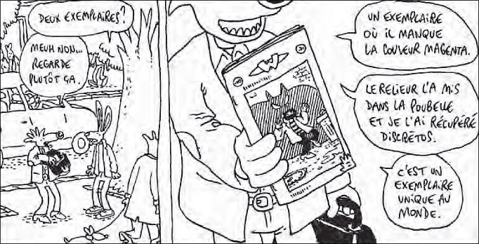 Qui dit Lewis Trondheim dit récit loufoque, et Capharnaüm ne déroge pas à la règle avec son casting de personnages tout droit sorti d'un manuel de fabrication de comics. Willard Watte est le parfait justicier masqué, Martin l'insupportable fanboy voulant bien faire, Gashinga le vilain mégalo que rien n'arrête et j'en passe... Des caricatures que soignent l'auteur dans des dialogues acerbes où chacun en prend pour son grade, comme un gigantesque concours de vacheries typique de l'humour de Lewis Trondheim. La comparaison avec Lapinot est évidente ici aussi : on ricane souvent, mais les séquences hilarantes restent rares et toujours surprenantes.