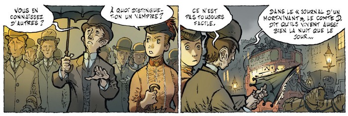 Hommage à la littérature vampirique anglaise du 19ème siècle, l'oeuvre de Bram Stoker en tête, D. nous emmène dans le faste des soirées londoniennes de l'époque, mais aussi dans le secret des chambres, où il n'est pas question de conter fleurette, mais plutôt de se repaître du sang de ses proies. Au fil des trois tomes, Richard Drake va devoir se fier à son instinct d'aventurier, mais également à l'étonnant Mister Jones, sage employé de banque qui ambitionne de devenir chasseur de vampire. Difficile de démêler le vrai du faux, les légendes et la réalité, quand tout échappe à son contrôle.