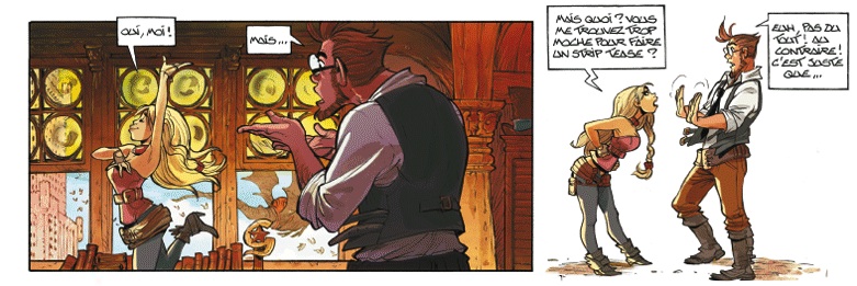 En dehors des décors, le barque tangue un peu cependant. Déjà à cause du fan-service omniprésent, même les shônen n'osent pas autant les close-ups sur la poitrine de leurs héroïnes, et non, la taille de leur bonnet n'est pas une excuse valable. Ensuite, l'expression des personnages n'est pas toujours adéquate, l'aspect humoristique étant parfois forcé. Faut dire que la plupart du temps, on ne rit absolument pas à cet humour de situation et ces calembours digne de Laurent Ruquier. La finesse ? Connait pas. Quand on trouve une blague, autant l'exploiter jusqu'à l'épuisement non ? Non. L'humour est affaire de dosage, le non-dit est souvent plus efficace que le déballage bien grivois et lourd. Le personnage de Yuri est un cabotin plus insupportable que charmant à cause de cette tendance à bien expliquer la blague. Quand on vous dit : "Regardez-moi, je suis drôle", vous pensez que la personne en question est le mec drôle de la bande ou bien qu'il est pathétique ? Si c'est dit avec du second degré, cela peut éventuellement passer. Ici, il n'y a pas de second degré. Comme tout le reste, on montre tout, ne surtout pas laisser le temps au lecteur de réfléchir, ne le lui laissons pas l'opportunité de combler les vides par lui-même. (Arleston a inventé le concept de BD pour temps de cerveau disponible, alors que le créateur de Lanfeust a tellement plus à donner. Il a réussi le tour de force d'enlever la magie d'une histoire qui traite pourtant de magie. Un exploit finalement.)