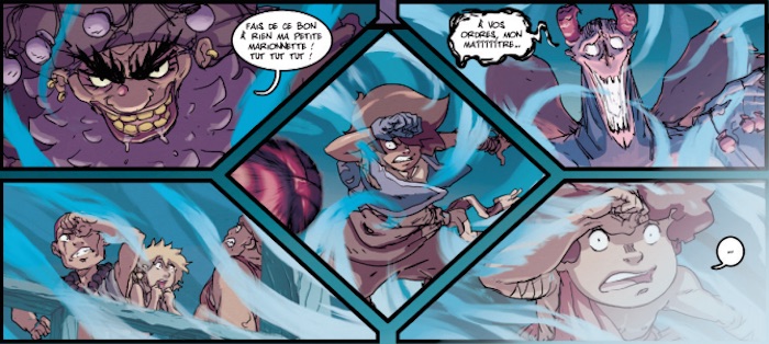 Le dessin manque peut-être parfois un peu de finesse, mais les pages sont bourrées d'énergie, les design des personnages et des golams réussis, entre inspirations anciennes et plus modernes. La mise en scène, et la colorisation évoque beaucoup l'animation, donnant presque l'impression de regarder un dessin animé tant le résultat est vivant.