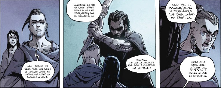 Si l'angle d'approche reste original, et permet de poser la problématique de la redistribution des richesses de façon moins complexe, la narration en elle-même est assez basique. Izu, le nom de plume de Guillaume Dorison, frère de Xavier, mélange ici quelques poncifes de la fantasy à capuche dans un monde post-apo construit en Images d'Epinal. L'héroïne n'est autre qu'une princesse, le conseiller de l'Empereur est forcément habité de mauvaises intentions et le chef de la garde va tout donner pour accomplir son devoir de la façon la plus bad-ass du monde. La galerie de personnages semblent être des modèles du genre qui ont été ici dupliqués en l'état.