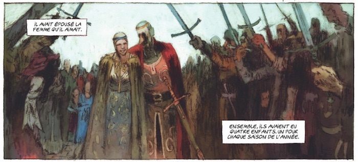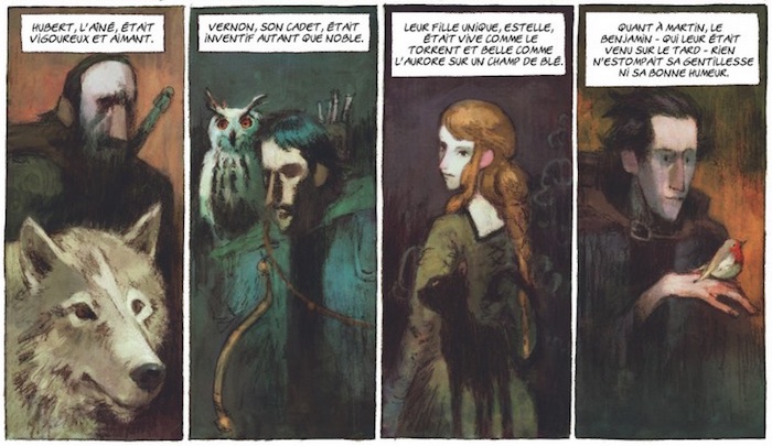 L'histoire est écrite avec intelligence et poésie, distillant l'essence du conte entre un récitatif (voix-off) qui apporte le rythme et l'ambiance dramatique, et des dialogues très réussis. On s'enfonce avec plaisir dans cette bande dessinée dont, très vite, on comprend qu'il ne pourra ressortir que malheur et souffrance. On retrouve réellement cette sensation si particulière de lire un conte. Il y a d'abord l'oralité, retranscrite avec talent à travers le narrateur qui nous narre l'histoire dans les récitatifs, mais aussi la structure de la bd, ponctuée par les missions des différents fils partis à travers le monde pour prouver leur valeur, ignorant tout du destin funeste que leur père prévoit pour l'un d'entre eux.