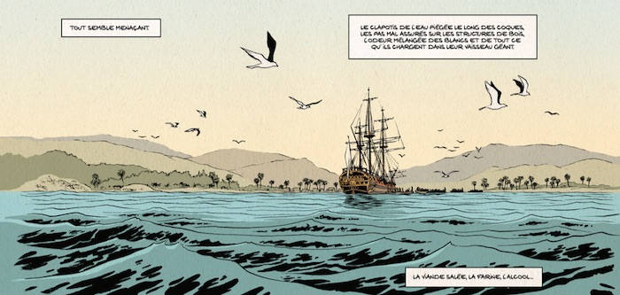 Les planches vont donc d'un récit à l'autre, nous racontant ce drame par petite touche pendant que l'auteur fait connaissance avec les lieux, les gens, et que les recherches avancent. Si au départ ce choix est un peu déstabilisant, voir frustrant, puisqu'on est coupé dans l'évolution de chaque histoire, cette narration devient encore plus fascinante. On découvre l'île dans son passé et dans son présent, et on s'attache encore plus aux deux histoires parallèles qui s'y déroulent. C'est un fait, chaque lieu que l'on traverse a connu et connaitra bien d'autres histoires avant et après nous (c'est d'ailleurs le sujet de l'excellent Ici de Richard Mc Guire). Cet ilôt inhospitalier en a vécu une forte et difficile il y a près de 250 ans, que nous raconte l'auteur en l'imaginant à partir de ce qu'il voit et ressent des lieux aujourd'hui.