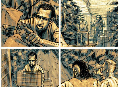 Pour le traiter, l'auteur, qui se passione pour les phénomènes sociaux, a recontré plusieurs immigrés marghrébins et s'est solidement documenté sur la question, afin de livrer un témoignange poignant, loin des clichés. Et quel témoignage ma foi. Vous vous en doutez, Les Mains Invisibles n'est pas une bande-dessinée simple à lire et à digérer. On y suit les aventures de Rachid, qui quitte sa famille et son pays, le Maroc, pour une Europe que tous ses compagnons fantasment, chacun à leur manière. Dès son introduction, l'histoire se révèle donc relativement dure, dépeignant le Maroc et la désillusion de ses habitants les plus démunis sans aucune pincette. A ce contexte difficile s'ajoute un traitement des personnages et des rebondissements crus. La violence verbale et physique fusent, et on perd très vite son souffle entre ce brutal sujet et son traitement tout aussi sec. Et ce n'est que le début, aussi bien pour le moral du lecteur que la santé de Rachid.
