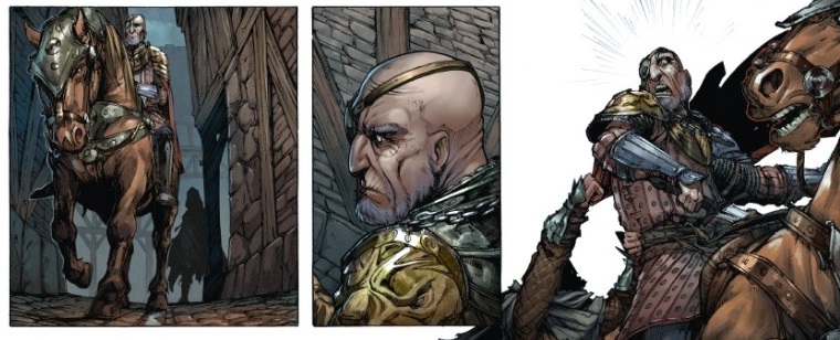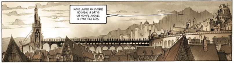 Non pas que nous nous soyons trompés sur toute la ligne. On commencera donc par évoquer les défauts de ce premier album. Le plus criant : son imaginaire, assez peu inspiré, au moins visuellement. Si le travail de Pierre-Denis Goux est dans l'ensemble plutôt solide, les tenues, architectures et paysages proposés n'ont rien de très singulier, et se limitent même parfois à de simples plagiats du Seigneur des Anneaux ou de Game of Thrones. Les références sont saines, mais le résultat contre-productif : notre imaginaire sera emprisonné dans ces images fortes, qu'on ne peut dissocier des deux grandes sagas. Sorti de l'univers des Maîtres Inquisiteurs par trop de proximité avec l'esthétique de grands classiques, le lecteur aura ainsi du mal à prendre ses marques, d'autant plus que les dessins de Pierre-Denis Goux ne seront pas toujours réalisés avec la même application, notamment à la fin de cette aventure, conçue pour faire le lien avec les tomes suivants.