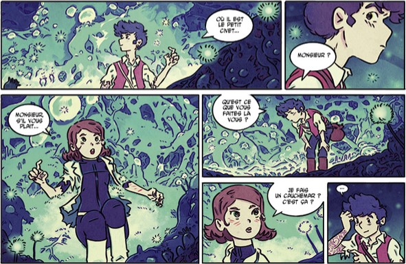 Côté dessin, on trouve là aussi des inspirations diverses. La narration fait penser à du franco-belge, la façon dont les personnages sont dessinés ont un côté manga. Les couleurs sont assez surprenantes : certaines pages sont entièrement dans des tons de violet, ou de vert... L'illustrateur Cédric Kernel laisse beaucoup de zones de blanc dans ses dessins, créant ainsi une ambiance très lumineuse.