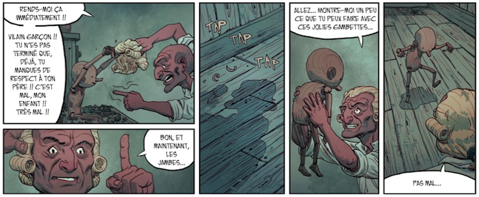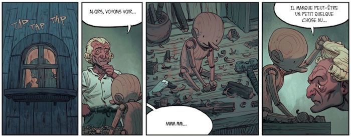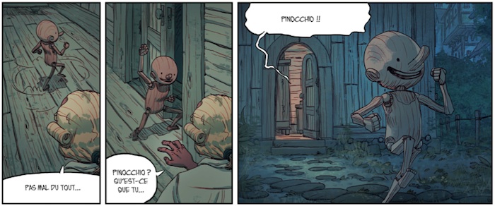 David Chauvel a choisi d'adapter librement le récit. Il reprend les personnages, et plusieurs faits particulièrement marquants de l'histoire de Pinocchio. Mais il n'hésite pas à le moderniser, le dynamiser, et à y ajouter des éléments nouveaux qui bousculent nos souvenirs. Le récit est particulièrement prenant, rythmé, drôle, touchant. Les dialogues collent parfaitement à l'esprit des contes, mais le scénariste y saupoudre une bonne dose d'absurde par moment qui les rendent particulièrement savoureux. A noter que l'histoire n'est pas édulcorée, et devient parfois sombre. Les vraies versions des contes de fées contenaient souvent une bonne part d'ombre, voir de violence.