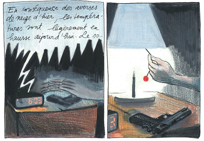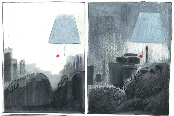 Le trait de Judith Vanistandael est gracile. Le dessin est parfois assez inégal (de son propre aveu, l'auteure n'aime pas vraiment dessiner des armes et des voitures) mais la colorisation aux crayons de couleur est très belle, apportant une forme de poésie et une lumière diffuse à l'atmosphère pluvieuse de cette histoire. Les teintes sont assez tristes et ternes, collant parfaitement au vécu du héros. L'encrage varie beaucoup d'un passage à l'autre, appuyant des ambiances diverses sur les plus de 350 pages que compte la bande dessinée. Si le dessin s'attache à montrer le quotidien, réaliste, quelques doubles pages se font plus viscérales, racontant visuellement les émotions difficiles qui traversent le héros, qui tente malgré tout de garder le cap.