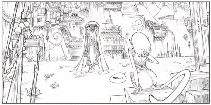 Et la magie prend. Ce nouveau tome de Sky.Doll, même sans les somptueuses couleurs qui apporteront encore plus de densité et d'émotion, est parfaitement réussi. Graphiquement, c'est évidemment un régal. Noa est toujours aussi sublime, les créatures sont toutes plus incroyables les unes que les autres et les décors sont d'une beauté à couper le souffle. Sans oublier les engins, les détails architecturaux... Sudra est une planète inspirée de l’hindouisme, dans son fonctionnement, sa société, mais aussi visuellement. C'est donc tout son folklore qui se mêle à l'imagination débordante des deux auteurs, pour créer un lieu où l'on voudrait se perdre pendant des centaines de pages pour en explorer tous les recoins. Alessandro Barbucci s'est encore surpassé et livre des planches plus belles les unes que les autres. Rassurez-vous donc tout de suite, votre attente sera plus que récompensée.