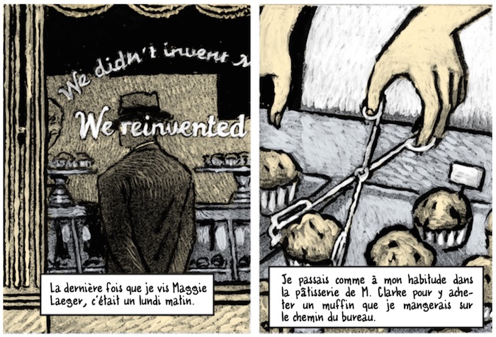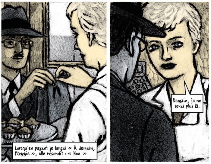 Par son dessin d'abord. Par petites touches de couleur, il crée une atmosphère, des décors et des personnages rétros et plein de douceurs. Il parvient à la fois à offrir des images fortes, comme des photographes, et une mise en scène très cinématographique, vivante. La présentation très carré des planches apporte un côté froid qui empêche un peu l'empathie et l'immersion, mais qui, associé à la colorisation pâle et un peu passée, appuie vraiment l'ambiance. Des journées froides, ennuyeuses et austères auquel Philip cherche à échapper à la poursuite de ces mystères.