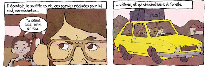 Pour mettre en image ces mots, le trait de Vincent Djinda est fin, vibrant, rendant parfaitement les émotions, les faiblesses aussi, qui traversent les personnages. Ses couleurs, elles aussi, rendent plus fortes encore les émotions. Passées pour les souvenirs d'enfance, grises pour les moments de dépression, fluos pour certaines émotions fortes, douces pour les instants heureux...