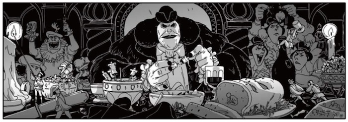 Toutes ces références-là, d'un point de vue graphique en tout cas, toutes ces influences-là sont extrêmement maitrisées, elles sont très codifiées. Il y a des anachronismes temporels. Ça joue sur des stéréotypes. Les costumes sont plutôt ceux de Bruegel par exemple. Même si ça ne respecte pas totalement la chronologie temporelle, ce sont des codes qu'on connait, et quand tu dis que tu as cette sensation d'arriver aux origines, c'est parce qu'on a justement utilisés tous les codes des origines.