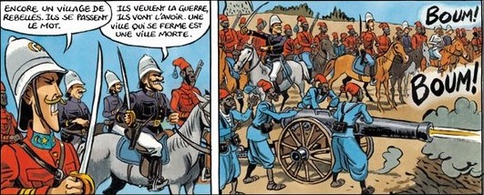 Suite et fin du dyptique de Christophe Dabitch et Nicolas Dumontheuil commencé en 2013. Inspiré de la mission "Voulet-Chanoine", expédition française colonialiste dont l'objectif était de conquérir le Tchad en partant d'Afrique Centrale avant les forces anglaises, mission peu glorieuse marquée par la violence extrême des soldats et la nonchalance des officiers, La Colonne revisite l'histoire sous l'angle de la caricature fantastique. Les auteurs s'appliquent à détourner chaque personnage, particulièrement le capitaine Boulet et le lieutenant Lemoine, chantres de l'officier raciste aux dents longues. Au-delà de la caricature, le cynisme ambiant détonne avec les couleurs vives et la bonhomie burlesque des personnages de Dumontheuil. Un cynisme qu'on doit aussi aux répliques de "l'esprit de la colonne", narrateur condamné à disparaître dès la première page, puisque le point de départ du récit coïncide avec l'anéantissement de la troupe sanguinaire...
