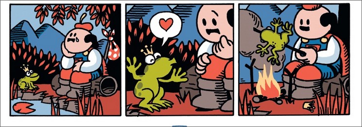 Il était une fois Dickie, un prince charmant que les fées ont certainement oublié à la naissance, spécialiste du détournement qui mène à la catastrophe. Après le cinéma et l'histoire, l'anti-héros de Peter de Poortere frappe au coeur le monde des contes de fées, tout de suite beaucoup moins enchanteur que dans nos souvenirs d'enfance. Pocahontas claque des suites d'une maladie contagieuse, Raiponce s'emmêle les tresses par la faute du prince et s'écrase au bas de sa tour tandis que la Belle au Bois Dormant se laisse tripoter... Des situations loufoques gonflées de cynisme qui confirme que Dickie est l'un des pires sales gosses de toute la bande dessinée. Et comme tous les sales gosses, Dickie a une victime attitrée pour prendre les coups en silence : Vickie, sous les traits de princesse qui aurait préféré ne pas apparaître. Le tout dans un écrin entièrement muet, d'une symétrie dont on a plus vraiment l'habitude mais très réussie. De l'humour noir et impitoyable comme je l'aime, mais qui ne séduira pas tous les publics.