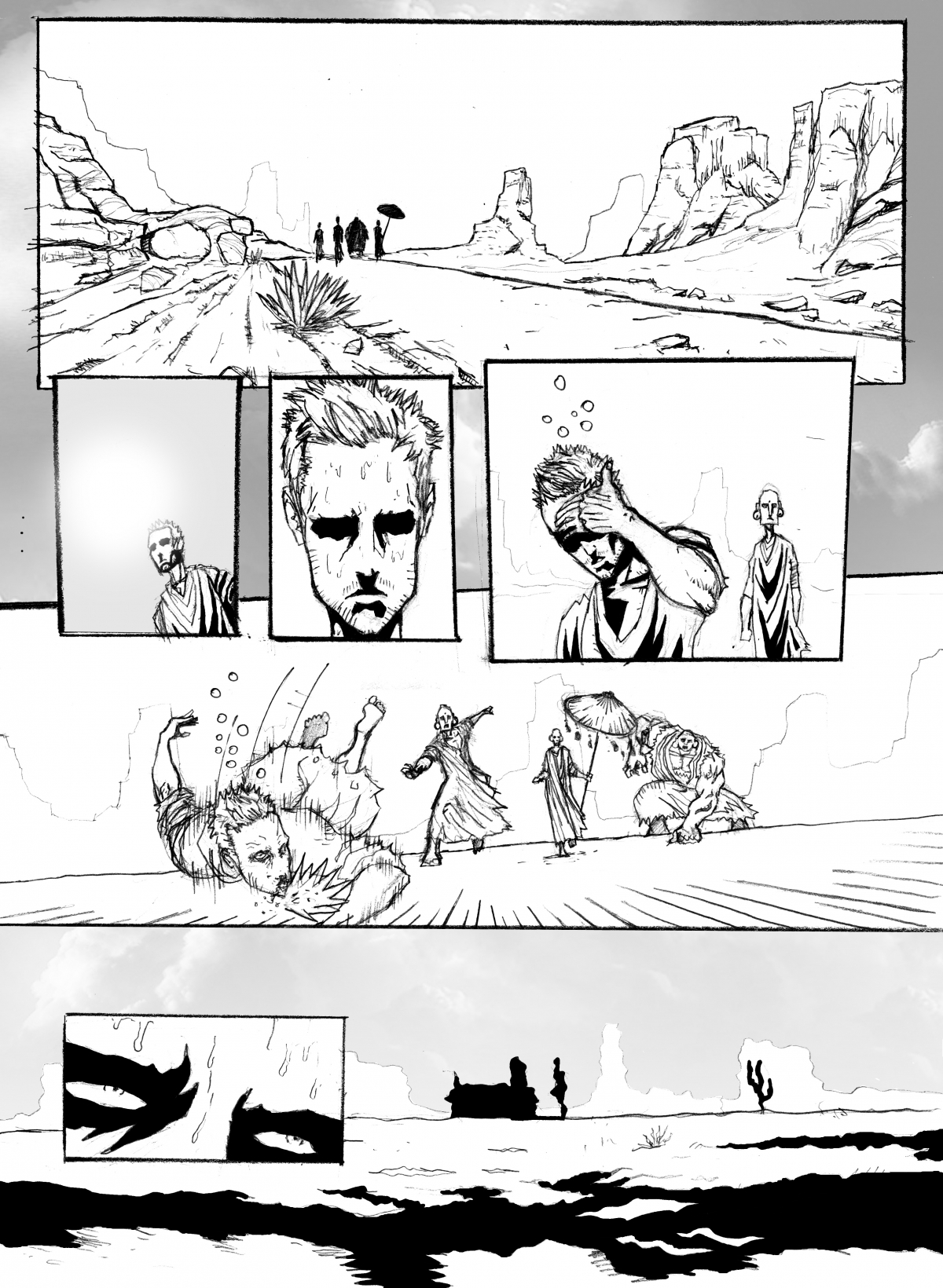 Vous trouverez les premières pages (1,2, et 3 avec le texte), la page 4 ancienne version, je suis en train de tout refaire, et un crayonné pour la double page qui présente le décor principal du premier chapitre de l'histoire