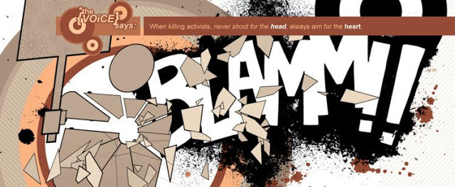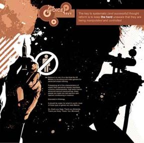 Mais poussant le vice plus loin encore, l'auteur crée un personnage, en la personne de « La Voix » et de son alter ego « public », qui use doublement de cette stratégie. Livrant un divertissement morbide au peuple en tant que dirigeant influent (en utilisant sa position de gourou d'une secte terroriste) et livrant des informations galvaudées aux membres dévoués de sa secte (en utilisant sa position de dirigeant influent), ce personnage vicieux et immoral monte les différents « camps » les uns contre les autres pour servir ses propres projets.