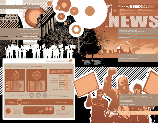 Nightly News est un album qui demande, peut-être encore plus que Pax Romana, un effort d'immersion de la part du lecteur. Habitué à un équilibre entre le texte et l'image, le spectateur risque bien d'être tout bonnement noyé dans l'affluence et le déséquilibre radical des deux.