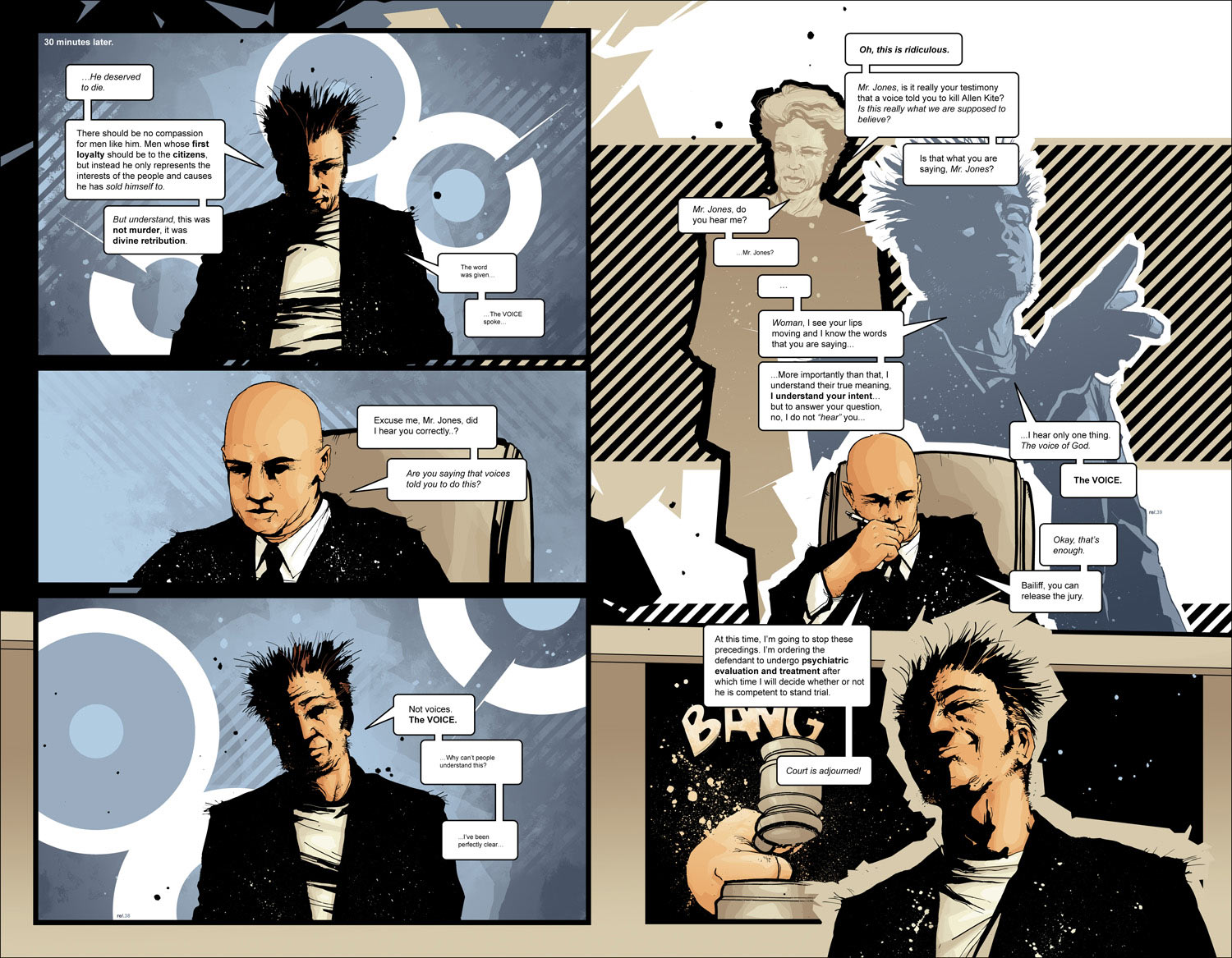 Encore une fois, Hickman applique à la lettre cette stratégie au sein de son œuvre ! En effet, « La Voix » et donc son alter Ego, le sénateur Jey Rector, organise ces attentats terroristes par le biais de sa secte pour publiquement proposer comme solution une libération totale de la liberté de la presse mais sans doute en réalité la restreindre, usant de ce projet altruiste comme alibis et couverture. Encore plus ironique, nous apprendrons à la toute fin du volume que le but premier était d'éliminer le plus de journalistes possibles et de tester le dévouement de ses ouailles pour le projet suivant : l'élimination des avocats ! Nous retrouvons là la double utilisation de chaque stratégie par la voix, usant de cette stratégie du faux problème pour à la fois faire passez un projet déguisé et tester l'engagement des membres de sa secte.
