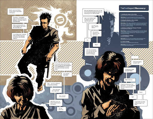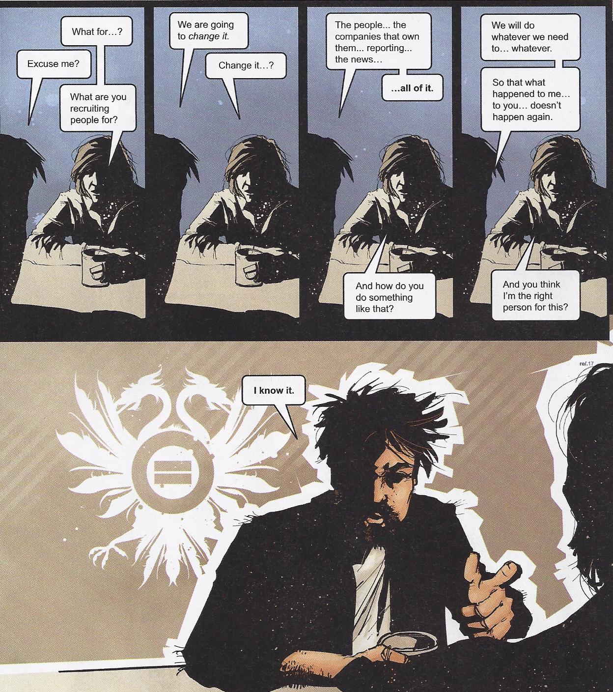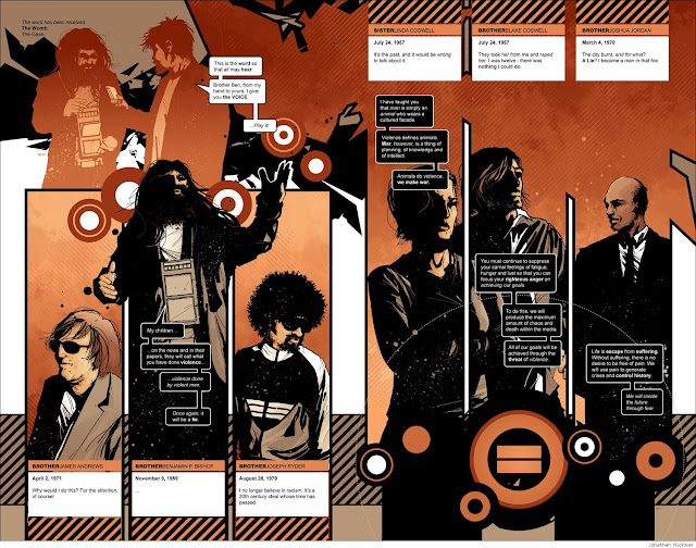 Nightly News illustre encore une fois très bien ce principe, mais cette fois davantage du côté de la secte que des médias. En effet, étalant son récit principal sur une courte durée, Hickman n'avait pas le loisir de remonter aux sources lointaines de la gangrène des médias, bien qu'il le fasse tout de même via les graphiques et statistiques du volume. L'auteur préfère aborder cette stratégie d'un point de vue plus personnel à travers les nombreux flash-back nous montrant l'enrôlement des membres de la secte, et en particulier celui de John Guyton, membre le plus dévoué. Nous découvrons alors que l'implantation des idées extrémistes de la secte n'a pas été faite du jour au lendemain mais bien sur une période de deux ans, alliant un discours condescendant et une attitude altruiste destinés à mettre des personnes brisés en confiance afin de mieux les manipuler sur la durée.